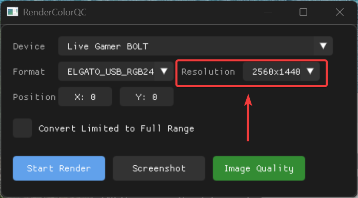 - In RenderColorQC, go to resolution settings